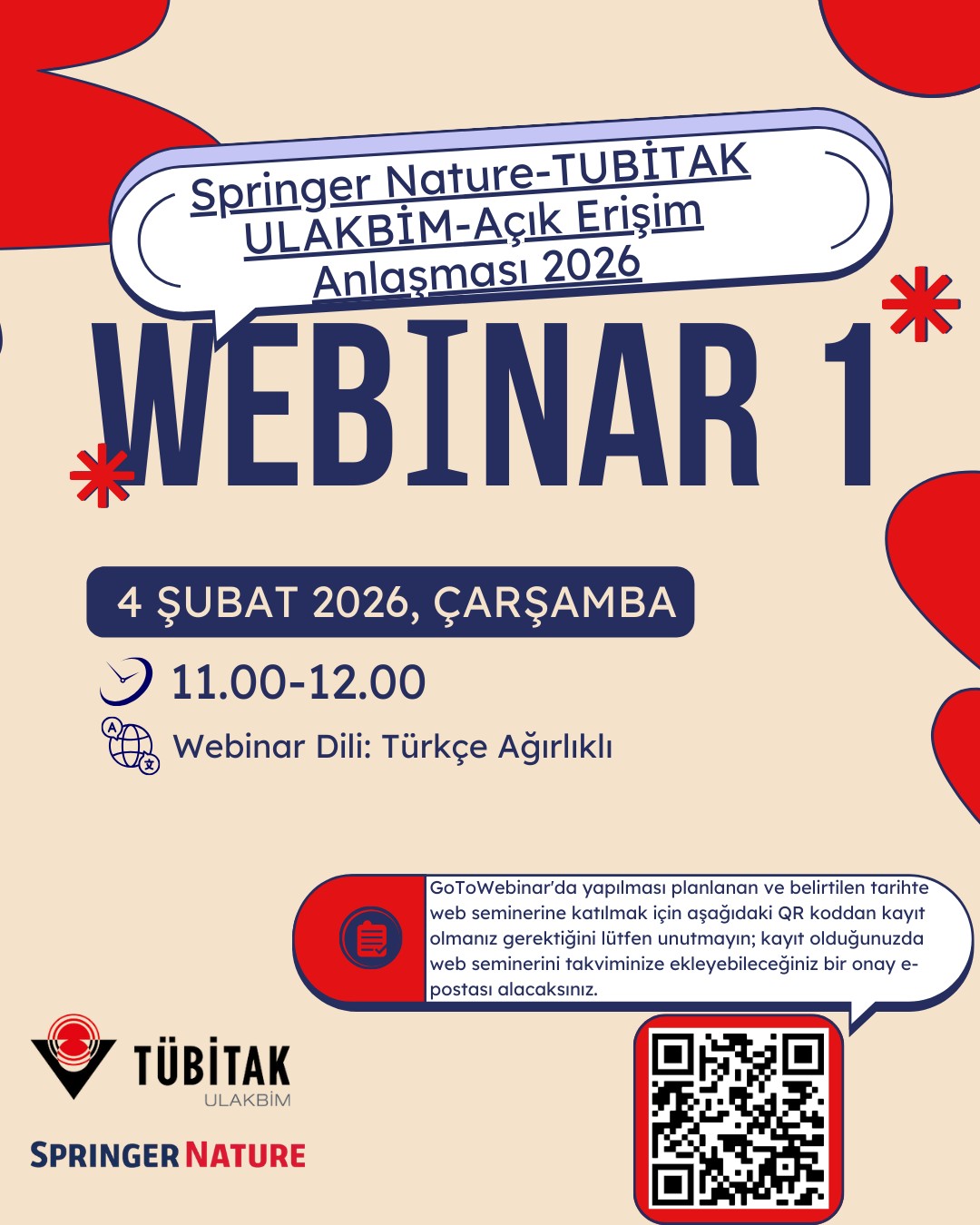 | İçerik | TÜBİTAK - ULAKBİM ve Springer TA_2026 Yılı İlk Webinarı TÜBİTAK - ULAKBİM anlaşmasının detaylarının aktarılacağı bu webinarda; anlaşmaya hangi kurumların katıldığı, yazar & makale tanımlama, yazarların başvuru sürecinden onay sürecine kadar takip etmesi gereken adımlar da dahil olmak üzere belirli başlıklara değinilecektir. Buna ek olarak yazarların makalelerini yazma süreçlerine yardımcı olmak adına; iyi bir makalenin nasıl yazılacağına ilişkin ipuçları ve püf noktaları da bu özel oturuma dahil edilecektir. Webinar sonunda soru-cevap kısmında merak edilen ve sıkça sorulan sorular yanıtlanacaktır. Webinar Başlığı TÜBİTAK–ULAKBİM & Springer Nature: Your Pathway to Open Access Publishing İçerik · TÜBİTAK – ULAKBIM TA Agreement Overview · Eligibility criteria/papers included in the agreement · Tips and tricks on writing a successful paper for publishing · Applying for funding to publish your article Open Access · Q & A Webinar Dili: Oturum ağırlıklı olarak Türkçe olacak ve birkaç bölüm İngilizce olarak ele alınacaktır. Tarih ve Kayıt linki GoToWebinar'da yapılması planlanan ve belirtilen tarihte web seminerine katılmak için aşağıdaki bağlantılardan kayıt olmanız gerektiğini lütfen unutmayın; kayıt olduğunuzda web seminerini takviminize ekleyebileceğiniz bir onay e-postası alacaksınız. |